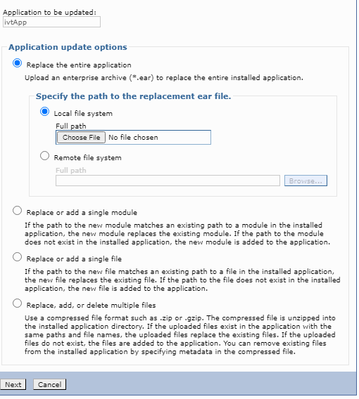 Use this option to update a file used by the application that is not an .ear, .war, .sar, .rar or, in some instances, a .jar file. Use this option to add or update .jar files that are not defined as modules in the application. To update an .ear, file use the Replace the entire application option. To update a .war file, .sar file, .rar file, or .jar file defined as a module in the application, use the Replace or add a single module option.