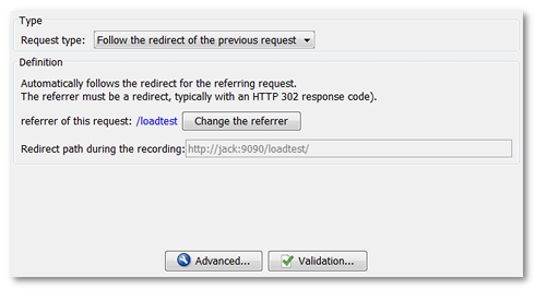 The present request is the target of an HTTP redirect in the response to the preceding request. When a request is defined as an HTTP redirect, the recorded URL or the parameters will not be used to play the request. Instead it will use the result of the preceding request dynamically (the preceding request must have a response of the type 302 Moved Temporarily). This is useful in the case of pages causing redirects containing dynamically-generated parameters (e.g. /searchresult.jsp?searchID=481825 where searchID is generated by the server).