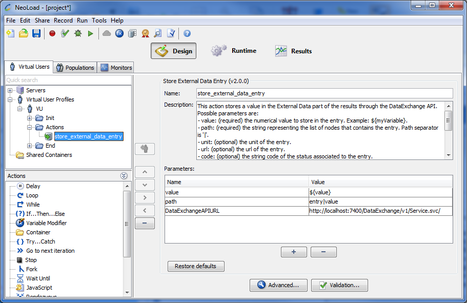 The Store External Data Entry Advanced action stores a numerical value using the Data Exchange API. This value is referred to as “External Data” in the Runtime and Results tabs. A typical use is to grab business-related metrics through a Variable Extractor or through the SQL action and store them for later analysis. The entry values can be structured in a tree by specifying different paths in the path parameter.